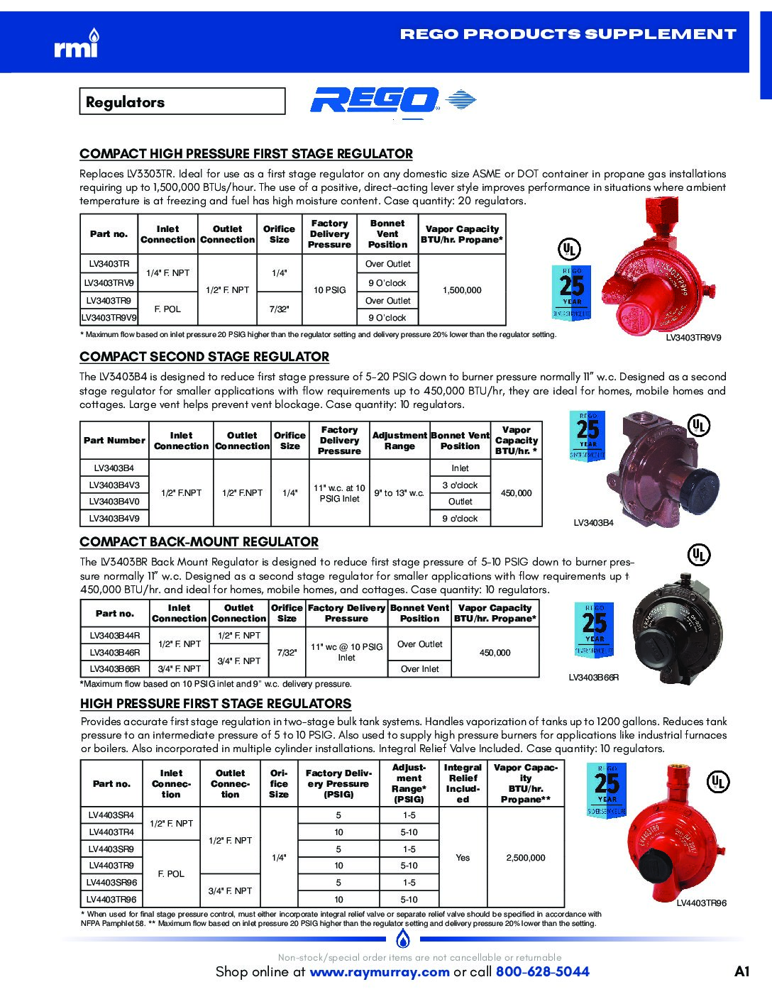 Welcome to Ray Murray Inc. Catalogs Online We’ve re-created our print catalogs for easy access via computer. Most Current Outdoor Products Price Sheets Most Current Hearth Products Price Sheets Download PDF: 2025-2026 Hearth CatalogSearch 2025-2026 Hearth Catalog PDF by Table of ContentsDownload PDF: RegO Addendum to RMI Catalog 2026Download PDF: Propane & Compressed Gas Catalog Edition 12Search Propane & Compressed Gas Catalog Edition 12 PDF by Table of ContentsDownload PDF: 2026 Outdoor Catalog CompleteSearch 2026 Outdoor Catalog Complete PDF by Table of ContentsDownload PDF: 2019 Rego CG500